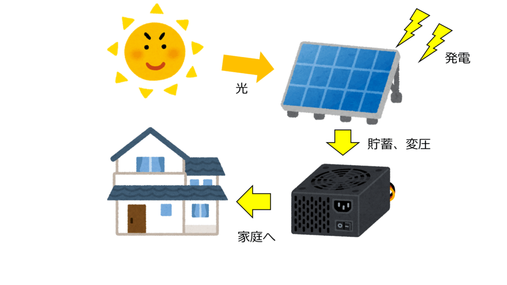 ソーラーパネルは皆さんご存じの通り、光を電気に変換するガラス板のことです。また、それにより発生した電気を電子機器で扱えるように貯蓄、変圧するのがポータブル電源の役割になります。