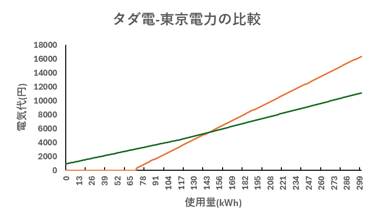 これら表から、タダ電を契約して無料分を超過した際に、どの程度の使用量までならおトクであるのかを調べました。
